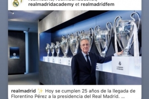 弗洛伦蒂诺迎来担任皇马主席25周年纪念日,俱乐部社媒发文致敬,本泽马转发了皇马俱乐部的社媒动态。