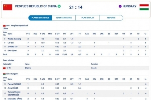 中国21-14匈牙利,张涛9分,刘贝7分5篮板。匈牙利塔玛拉-碧翠克斯-塞伦切什空砍8分。