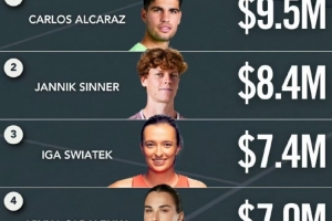 体育资讯7月18日讯 本年度网球赛事结束前三个大满贯争夺,相关媒体统计了本年度球员的奖金收入情况,阿尔卡拉斯950万美元领跑,辛纳840万美元第二,斯瓦泰克740万美元第三,萨巴伦卡700万美元第四,高芙560万美元第五。