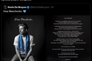 体育资讯4月4日讯 克罗斯今天在推特发文,对德布劳内离开曼城一事作出了回应。