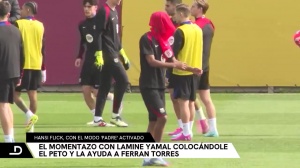 亚马尔在训练前摆弄着训练背心,并套在头上。随后,弗里克出现在现场,拿起衣服并帮助亚马尔正确穿上。密切关注这一时刻的亚历杭德罗-巴尔德拍了拍亚马尔,说“醒醒!”激起亚马尔的笑声。