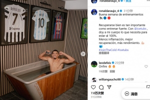 体育资讯7月20日讯 巴萨后卫阿劳霍更新社交媒体,晒出了自己在结束训练后的恢复照。