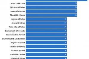 5次:维拉&卢顿、布莱顿&切尔西、利兹联&热刺、曼联&森林