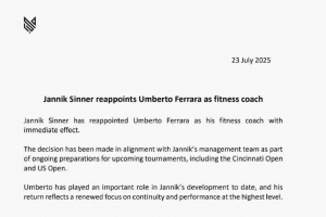 体育资讯7月23日讯 现男子网球世界第一辛纳团队发表声明,体能师翁贝托-费拉拉回归团队,原来的体能师帕尼奇将加入鲁内团队。