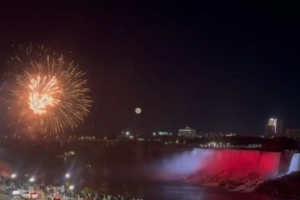 美国知名地标尼亚加拉瀑布也亮灯红、黑、白三色并燃放烟花,欢迎曼联造访美国。
