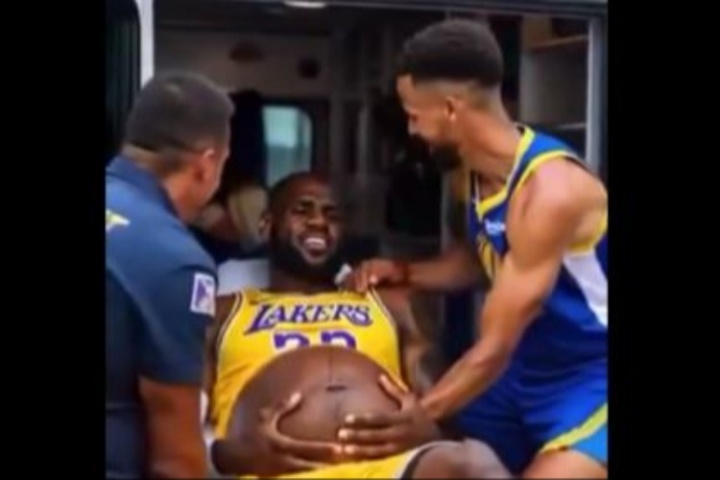 在詹姆斯的AI怀孕视频中,有一则是詹姆斯怀了库里的孩子,结果生出了一个像哈登的宝宝,而门外的哈登发出了小卡的经典尬笑。