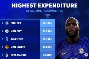 体育资讯7月25日讯 《转会市场》统计了各队历史转会费总支出情况,切尔西独自领跑。