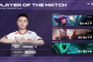 体育资讯7月25日讯 在刚刚结束的LCK常规赛的比赛中,Keria三局合砍0/10/38的战绩,拿下T1对阵GEN系列赛MVP。