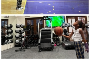 照片中Capri也模仿父亲科比手缠着厚厚的绷带,单手托着球,望向前方。