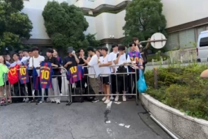 体育资讯7月26日讯 据科贝电台报道,日本球迷在酒店外等待巴萨球员。
