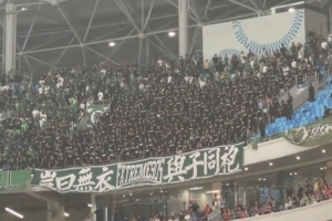 赛后,两队球员相互致意期间,看台一角的国安球迷集体高呼:“丢人现眼!”