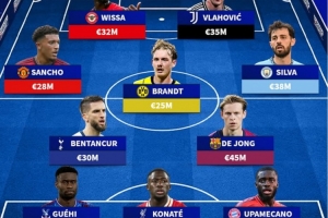 中场:桑乔(曼联,2800万)、本坦库尔(热刺,3000万)、布兰特(多特,2500万)、德容(巴萨,4500万)、B席(曼城,3800万)
