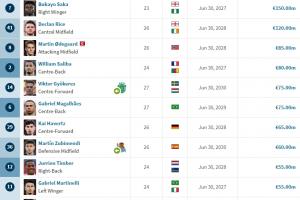 阿森纳队内身价排名:约克雷斯7500万空降第五,萨卡、赖斯破亿