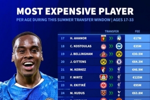 体育资讯7月28日讯 今夏各大联赛重磅引援不断,《转会市场》也列出了从17岁到33岁的各年龄“标王”。
