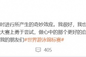 赛后,老将徐嘉余更新了社媒,他写道:当岁月和变革同时进行所产生的奇妙效应。我很好,我也在希望以后变得更好。希望在每一场国际大赛上勇于尝试,做心中的那个更好的自己。感谢每一位关心支持中国游泳和关心我的朋友们。