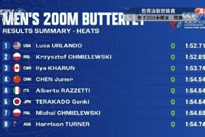 陈俊儿预赛游出1分54秒54,排名所有选手第四,晋级半决赛。