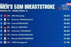 体育资讯7月29日讯 2025新加坡世界泳联世锦赛,男子50米蛙泳半决赛,覃海洋第二组7道出场,最终26秒52小组第一,也是半决赛第一晋级决赛。