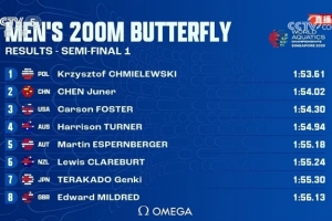 体育资讯7月29日讯 游泳世锦赛男子200米蝶泳半决赛,中国游泳运动员陈俊儿游出了1分54秒02,排名小组第二晋级决赛。
