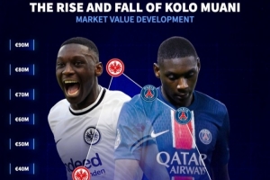 穆阿尼在效力南特时期身价不过1千万欧元。合同到期免签加盟法兰克福后,他的表现非常抢眼,打出46场23球14助攻的惊艳数据,身价暴涨至8000万欧元。