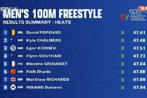 潘展乐预赛中游出47秒86,排名总成绩第六名,晋级半决赛。
