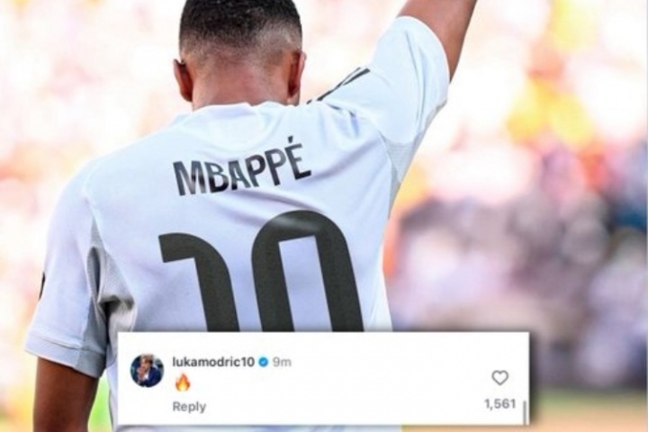 姆巴佩在社交媒体上晒出自己身穿10号皇马球衣的照片,莫德里奇随后在该条社媒下评论:🔥
