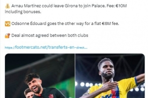 据悉阿诺-马丁内斯从赫罗纳转会至水晶宫,转会费为1000万欧元,包含奖金条款。而爱德华则将以600万欧元的固定费用加盟赫罗纳,两家俱乐部几乎达成了一致。