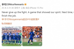 体育资讯8月2日讯 中超联赛第19轮,上海申花客场在0-3落后的情况下,4-4战平云南玉昆。赛后,申花球员李可更新了个人社交媒体。