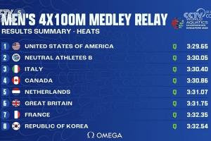 体育资讯08月03日讯 2025年世界泳联世锦赛男子4×100混合泳接力预赛,由汪顺、覃海洋、徐放、潘展乐组成的中国对队3:32.69排名小组第四,总排名第9无缘决赛。