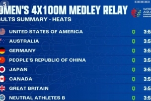 新加坡游泳世锦赛今天上午进行了女子4x100米混合泳接力预赛,由万乐天、杨畅、余依婷、吴卿风组成的中国队游出3:56.70的成绩,最终排名小组第三总成绩第四,成功晋级决赛。排在预赛前三位的是美国队、澳大利亚队和德国队。