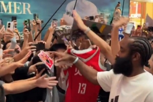Tomer Azarly写道:“詹姆斯-哈登一年一度的中国行让广州这家商场挤满成千上万的粉丝!从雷霆队、火箭队、篮网队和快船队的球衣到哈登 Vol. 7、8 和 9系列的球鞋,那里应有尽有。”