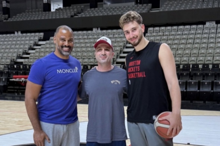 火箭场边女记者Vanessa Richardson晒图,申京和乌度卡在伊斯坦布尔合影。中间位置是申京在当地的训练师Ertan Bedir。