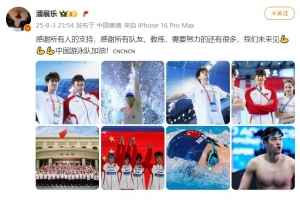 潘展乐晒出了游泳队的合照以及多张自己的赛场图,并配文写道:感谢所有人的支持,感谢所有队友、教练,需要努力的还有很多,我们未来见,中国游泳队加油!