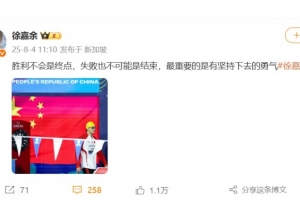 徐嘉余写道:胜利不会是终点,失败也不可能是结束,最重要的是有坚持下去的勇气。