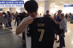 Favian Renkel社媒晒出照片,一位接机的球迷手上拿着印有孙兴慜印号的洛杉矶FC球衣。