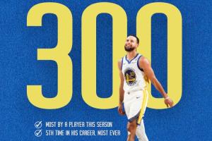 本赛季库里命中293记三分,距离个人第6个单赛季300+三分也只有一步之遥。
