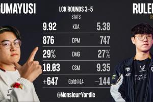 体育资讯8月7日讯 今日外媒Monsieur Yordle发布了2025 LCK第3-5轮中Gumayusi与Ruler数据对比,其中包括KDA、分均输出、输出占比、分均补刀、14分钟对位经济差,Gumayusi五项数据全面领先Ruler。