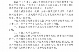 体育资讯8月8日讯 中国足协官方消息,对江苏女足主教练陈婉婷停赛1场罚款5000元。