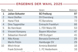 德国最佳教练得票:舒斯特尔97票居首,弗里克第3&孔帕尼第6
