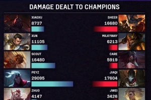 体育资讯8月11日讯 在今日的LPL第三赛段比赛上,FPX首局溃败不敌JDG,而本局比赛中Care阿卡丽打出打出5919的伤害,而milkway的皇子打出6213的伤害!