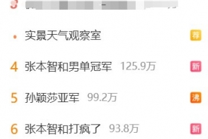 这6个微博热搜分别为:王楚钦vs张本智和、王楚钦亚军、张本智和男单冠军、孙颖莎亚军、张本智和打疯了和张本智和医疗暂停。其中,微博热搜第一为王楚钦vs张本智和。