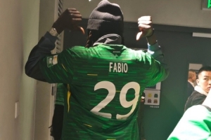 北京首钢外援纳扎尔和奥莫特身穿法比奥的国安29号球衣,来到工体观赛。赛后,二人还在球员通道等待法比奥的到来。
