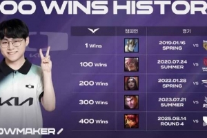 ShowMaker:(400胜里)首先第一场我很紧张,还有在第一个100胜里建敷(Canyon)用豹女收获了LCK首个打野五杀,有点印象深刻.
