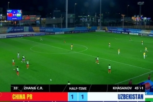 国足遭扳平!王一防守漏人致丢球!第45+1分钟,乌兹别克斯坦右路传中,王一防守致命漏人,哈萨诺夫捅射破门,国少1-1乌兹别克斯坦!↓