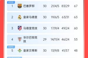 体育资讯04月06日讯 西甲第30轮,马竞客场2-1绝杀塞维利亚,终结西甲3轮不胜。由于本轮皇马1-2负于瓦伦西亚,巴萨1-1战平贝蒂斯,马竞与榜首巴萨的分差缩小到了7分。完整西甲积分榜情况如图。