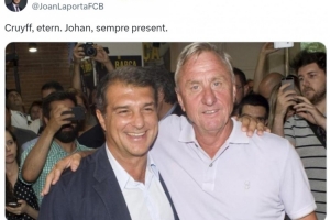 克鲁伊夫逝世九周年之际,拉波尔塔在社交媒体上晒出与这位俱乐部传奇的合照,并配文:“克鲁伊夫,永恒不朽;约翰,永伴我们。”