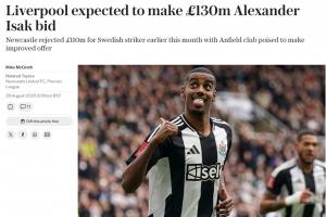 纽卡对这位瑞典前锋的估价为1.5亿英镑,有消息称,利物浦基础报价为1.3亿英镑,加上附加费和奖金,这笔转会费总额将创下英国转会纪录。