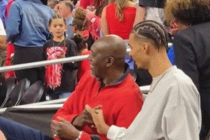 文班亚马被拍到来到场边看球,并与火箭名宿“大梦”奥拉朱旺并排坐,两人聊了几句。