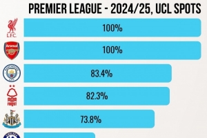 体育资讯4月8日讯 Foot Rankings列出了英超欧冠资格最新概率,曼城83.4%,诺丁汉森林82.3%,切尔西降至40.3%。