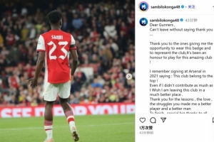 洛孔加社媒告别:未能如愿做出更多贡献,为阿森纳是我的荣幸