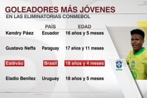 体育资讯9月5日讯 北京时间今天上午进行的南美世预赛,埃斯特旺倒钩破门,目前巴西主场3-0领先智利。据ESPN统计,现年18岁4个月的埃斯特旺是南美世预赛历史第三年轻进球者。
